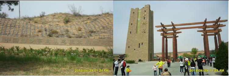 我們在沙坡頭旅游黃河區(qū)(南區(qū))買了門票,隨著人流,進入景區(qū)。景區(qū)主大門是一個四四方方的立柱,加上“井”字形建筑造型構(gòu)成,立柱頂部呈長城烽火臺垛口造型,立柱右側(cè)上部有三個鎏金大字“沙坡頭”。 在景區(qū)大門東側(cè),是沙漠博物館,它的頂部呈金字形造型,游客可以免費進去參觀。