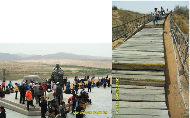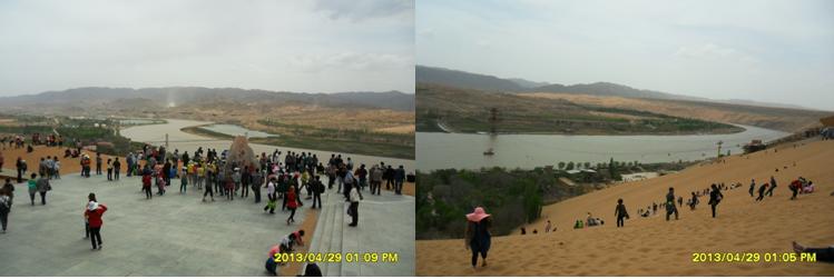 沿著黃河東岸,由南向北,走在河岸邊的木質(zhì)人行棧道上,微風輕拂,游客熙熙攘攘。棧道下面,不時發(fā)出一陣陣黃河浪拍打岸邊卵石的聲音,棧道西側(cè)是廣際的黃河河面,沙坡頭特有的羊皮筏子載著游客,順著主河道東側(cè)漂流而過,偶爾漂入浪谷,游客不時發(fā)出一些驚嚇聲;主河道及西側(cè),間或有旅游快艇飛馳而過,拉起一道道浪花。棧道東側(cè)是旅游觀光車的通道,乘坐觀光車每人次費用20元,觀光車駕駛員兼講解員,沿途不停的向游客解說景點。路邊涼皮、涼面小攤,食物價格不菲,一份6元的涼皮、涼面賣到10元,一只4元的鹵雞腿售價7元,普通瓶裝健力寶等飲料賣到5元,比市區(qū)價格多出2元。